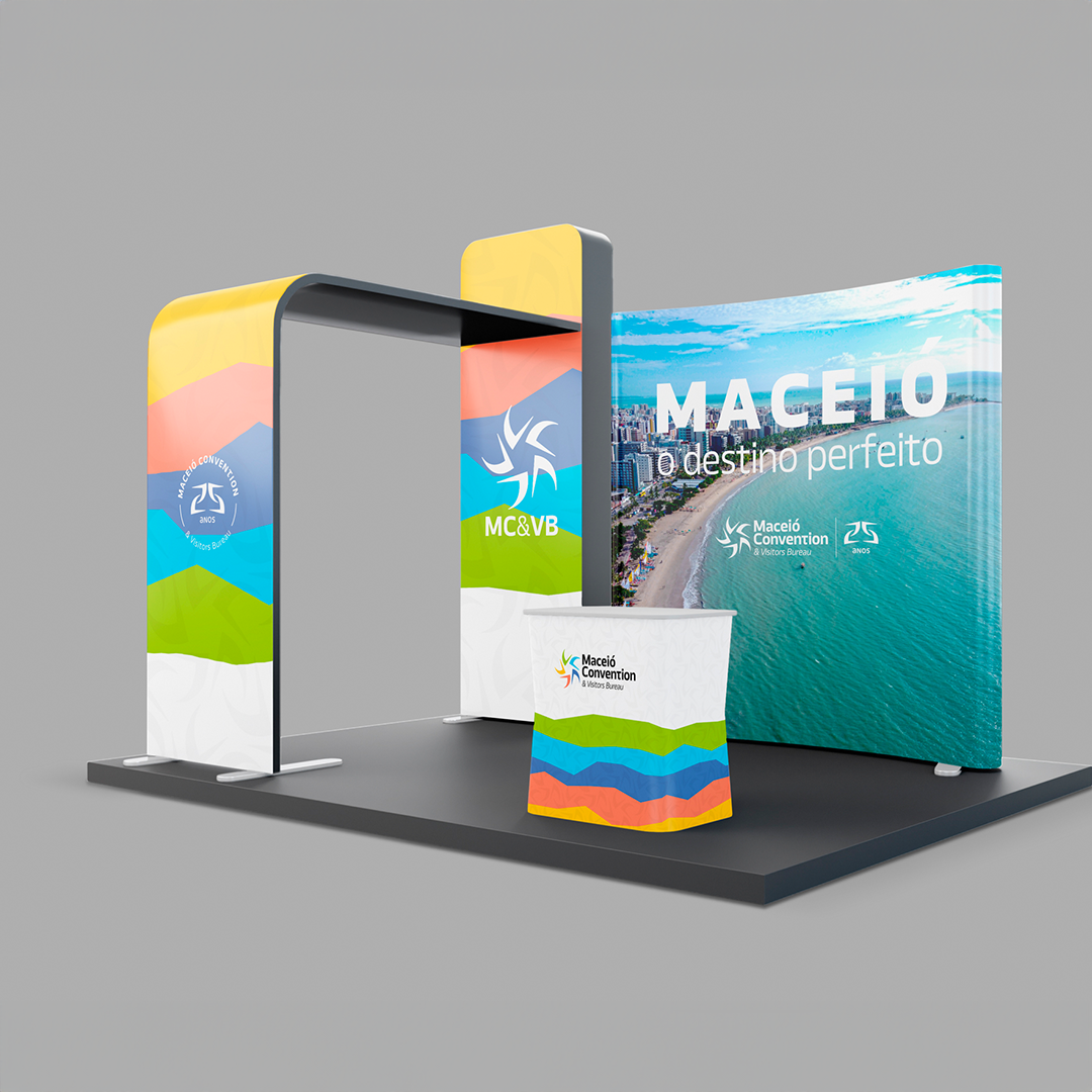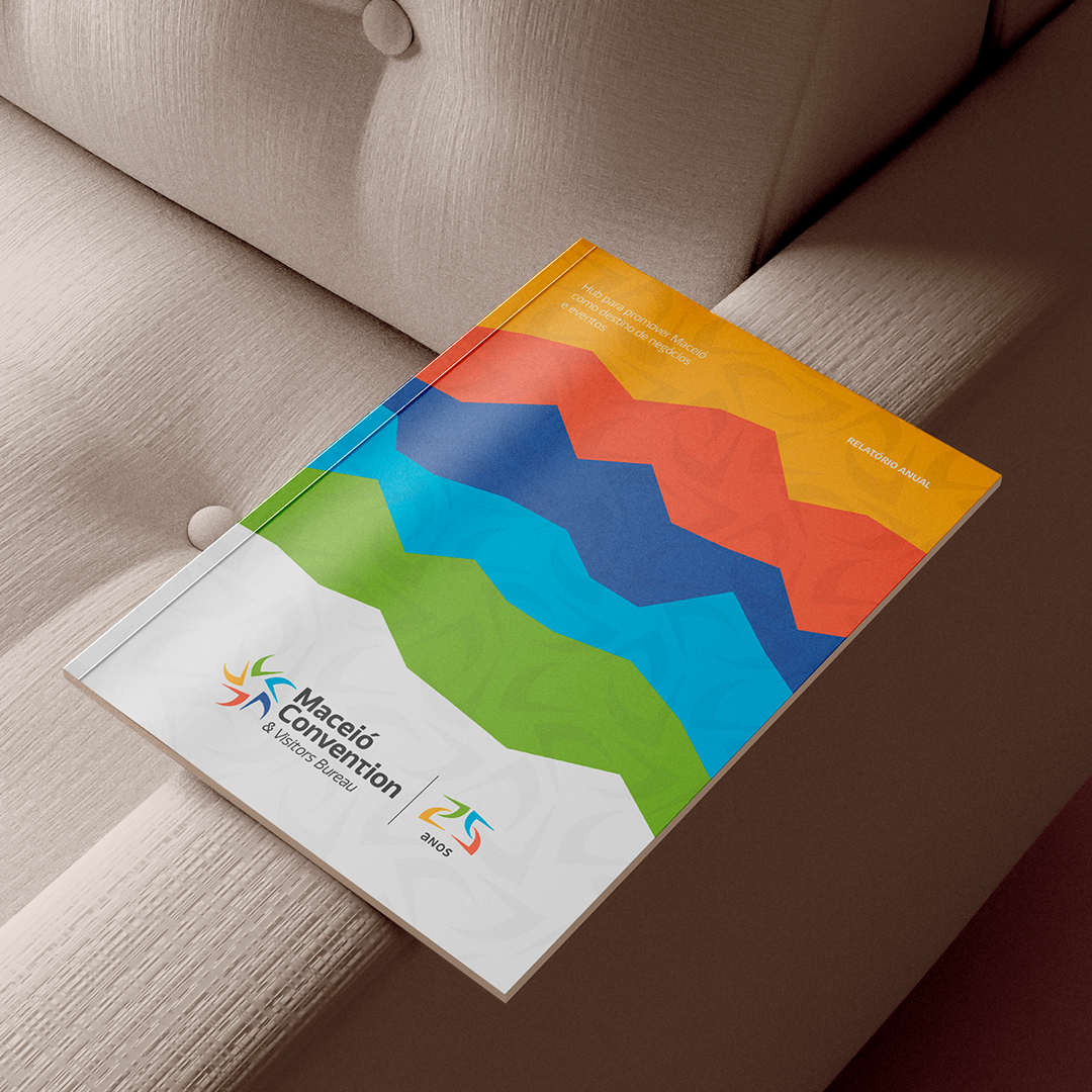Nosso desafio foi modernizar a identidade visual da instituição, criar o selo comemorativo de 25 anos e desenvolver a submarca 'Maceió para Eventos'. O projeto realizou um redesign estratégico do símbolo original, mantendo a conexão histórica através da 'vela' da jangada, mas agora expandida em cinco elementos cromáticos que representam os ativos da cidade: a vegetação (verde), o sol e a areia (laranja), o calor das pessoas (vermelho), a inovação (lilás) e as águas (azul). Juntas, as velas formam uma estrela com a dinâmica de uma pessoa em movimento de dança, gerando um sistema visual versátil que foi desdobrado no selo de aniversário, em padrões de textura exclusivos e em toda a comunicação de estandes e materiais promocionais.